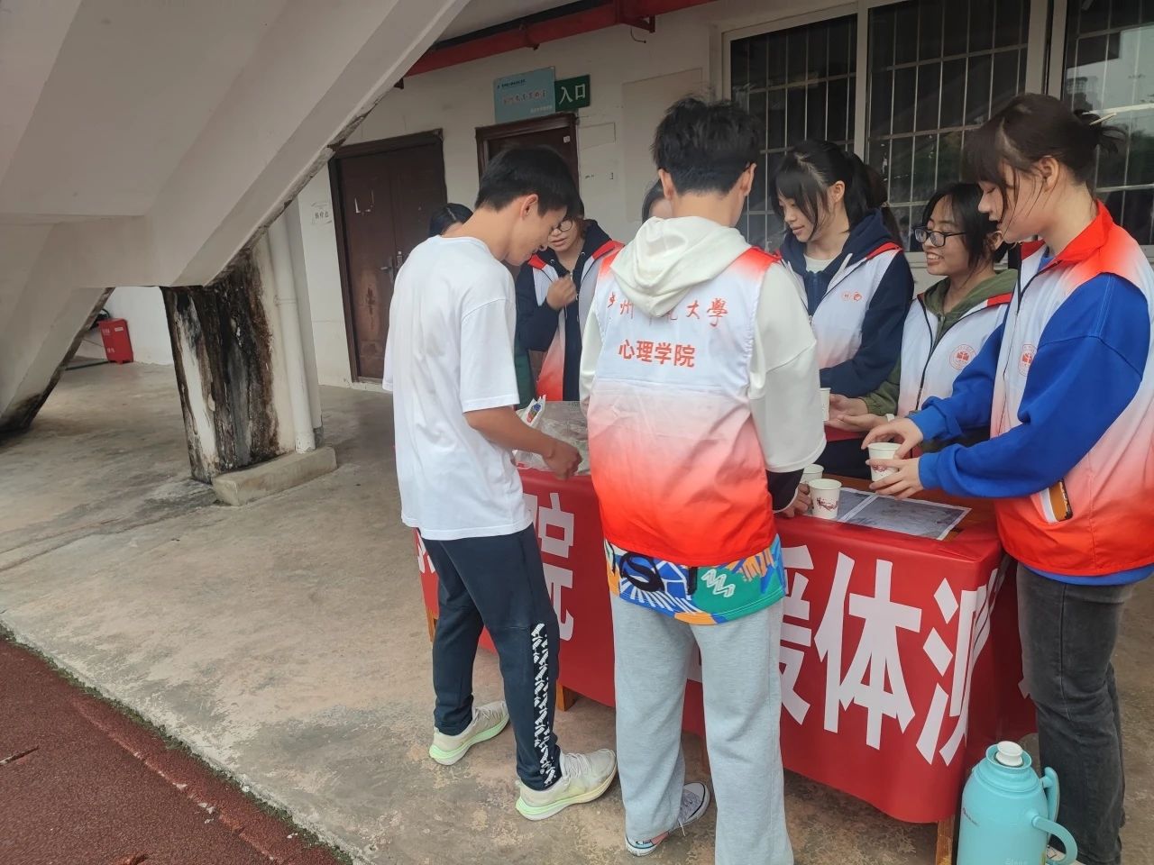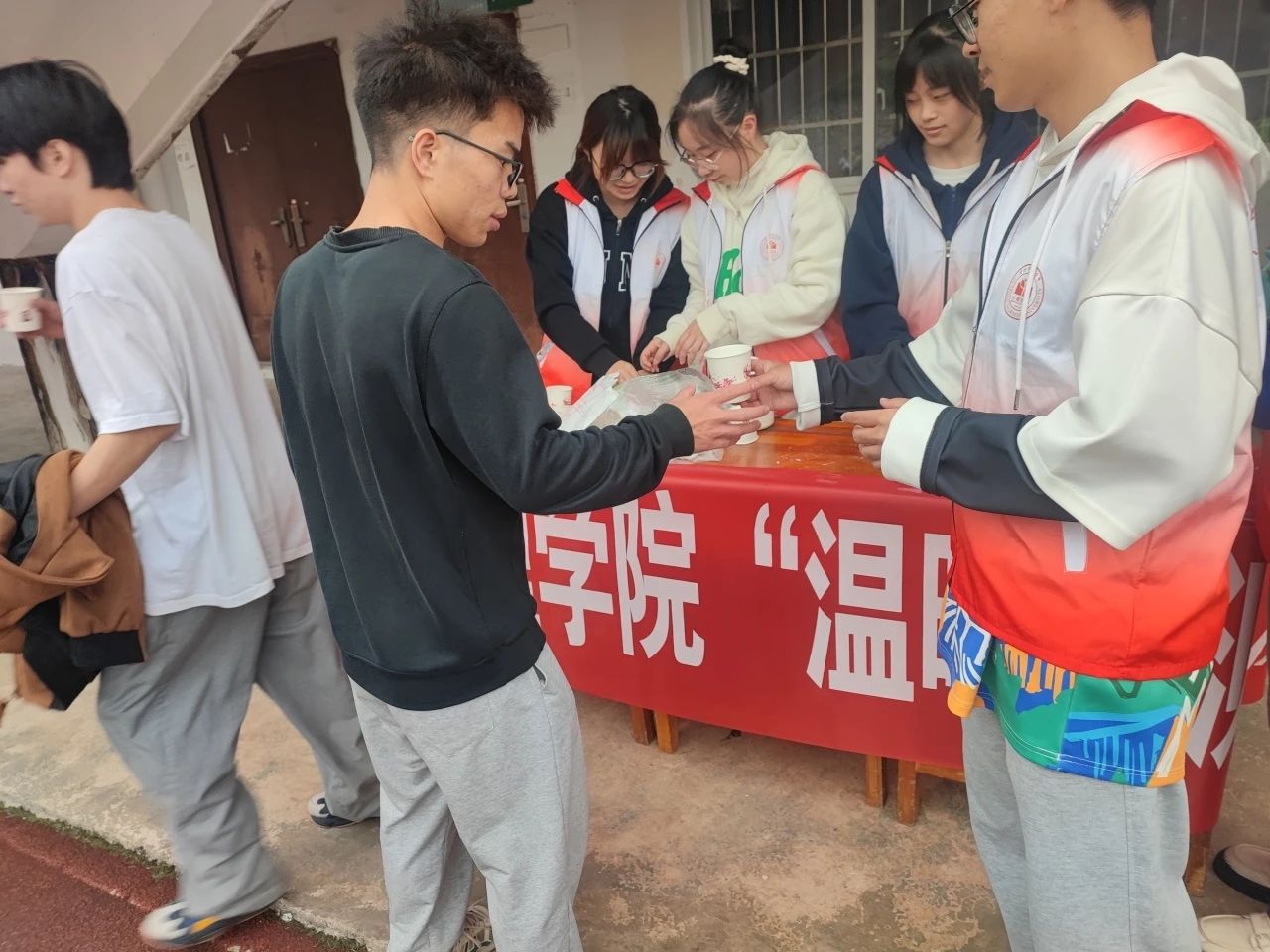 活动当天,志愿者们提前到场,布置好服务点,备好热水、葡萄糖等补给品。志愿者们等候在800米、1000米的终点线处,为测试完毕的同学们送上适温的葡萄糖水,提供暖心的服务。活动过程中,志愿者们始终秉持着一丝不苟、认真负责的态度,热情细致地对待每一位同学,温暖同学们内心的不只有热水,还有志愿者灿烂的笑容。